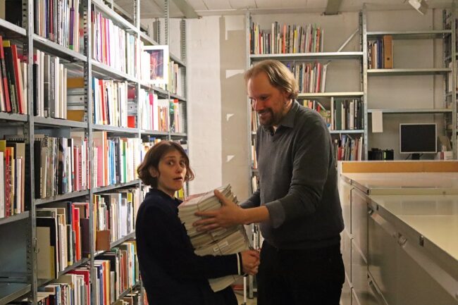 Eine öffentliche Sammlung, die wir bereits beschenken durften, ist die basis wien. (Siehe Beweisfoto von der Übergabe der Gesamtausgabe durch skug-Chefredakteur Frank Jödicke an die Geschäftsführerin der basis wien, Helene Baur). Der basis wien möchten wir an dieser Stelle danken, dass sie uns Unterschlupf gewährt und den entsprechenden Raum für die nötige Sortierarbeit. Die basis selbst ist eine ganz wunderbare und schlaue Institution und man darf sagen, hier haben sich die richtigen gefunden. In der Sammlung der basis wien werden seit 1997 nicht die großen Werke der Kunst gesammelt, sondern es wird an einem vielleicht viel wirklichkeitsnäheren Abbild der Kunstproduktion gearbeitet, das sich in Flyern, Einladungen, kleinen Ausstellungsbeschreibungen oder sonstigen Publikationen niederschlägt. Diese »Sekundärmaterialien« sind selten oder nie von monetärem Wert, sie schreiben aber die Geschichte einer lebendigen Szene. Eine Geschichte, die nicht die der durchaus ja auch am Profit orientierten Big-Player des Kunstbusiness ist, sondern ein Abbild des Werkens und Wirkens unzähliger Künstler*innen, die vielleicht vom üblichen Betrieb nur hier und da erwähnt wurden (die aber schlau genug waren, ihre Ausstellungen der basis wien mitzuteilen). Das ist auch so ein bisschen, fast könnte man jetzt sagen, »Ästhetik und Politik von unten«, weil die basis nicht mitmacht bei der offiziösen Kunstgeschichtsschreibung, die gerne die teuren Genies aufzählt und dann mit tiefgebeugtem Haupt rückwärts zur Tür zurückschleicht.