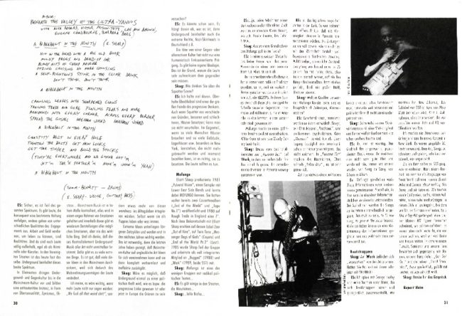Vor 30 Jahren war es soweit: Die Nullnummer von skug ist im Oktober 1990 erschienen. Damals noch mit dem Untertitel »Subversive Wisdom«. Vielversprechend, mit Henry Rollinsʼ Rücken samt tätowierter Sonne am Cover. Rollins hatte damals ein Gespräch mit skug verweigert, wir hatten aber tolle Fotos von Klaus Heim, Manfred Rahs und Margarete Straka (leider ohne Credits im Artikel). Flugs wurde eine Titelstory aus einem nicht übersetzten englischsprachigen Interview und Passagen aus dem Buch »Talks«, ediert von Robert Fischer, gezimmert. Dass Rollins aufs skug-Cover gehievt wurde, wurmte Alben-Rezensentin Cindy Blechkramf, die dafür eine Entgegnungskolumne hinten im Kulturteil bekam. Als Virginity oder Jizz Onto war sie übrigens im Synthie-Duo Aftertouch singender Anti-Macho, wie dem vorderen Mix-Teil auf Seite 6 zu entnehmen ist. Dort berichtete ein gewisser Fred Heitzer aka Didi Neidhart aus der überschaubaren Salzburger Subkulturszene. In den Spalten gegenüber Blechkramfs »Zum Titelbild« schrieb Birgit Hebein (derzeit grüne Wiener Vizebürgermeisterin) experimentelle Literatur: »Kennen Sie William S. Burroughs?« ist das etwas andere editoriale Inhaltsverzeichnis von skug Vol. 0. Hebein engagierte sich damals für die Musiker Christof Kurzmann und Helmut Heiland (später übrigens erster Webmaster von skug.at), die wegen Wehrdiensttotalverweigerung angeklagt wurden. skug solidarisierte sich eine Seite davor mit Sigi Eckers Medienkritik an einem Bundesheerplakat titels »Im Heer herrscht Glied«. Es gibt viele weitere Fundstücke, wie Harald »Huckey« Renners geniales Review »Edutainment« der Boogie Down Production – angesiedelt in der Rezensionsrubrik Vinyl (!) –, doch wollen wir anlässlich 30 Jahre skug endlich zum monatlichen Textschatzheben kommen. Im definitiven Jubiläumsmonat Oktober würdigen wir den Tiroler Rupert Heim, ohne dessen unermüdliche Vorarbeit skug nie das Licht der Welt erblickt hätte. Mit seinem 1990er-Interview mit Elliott Sharp, den Manfred Rahs im damaligen Underground-Hotspot B.A.C.H ablichtete.