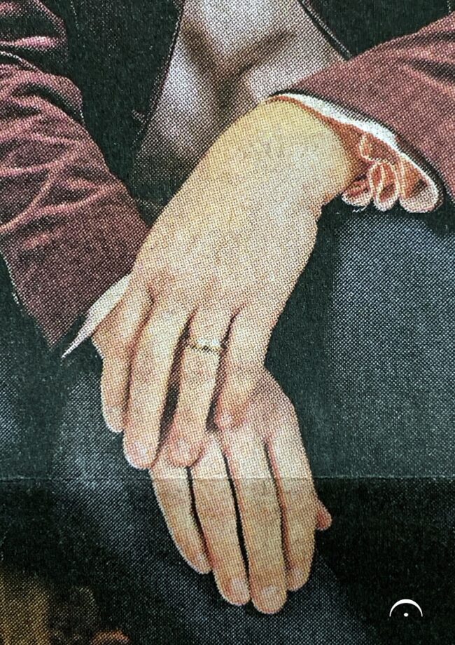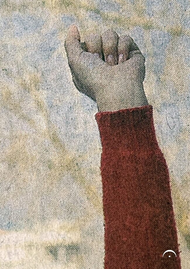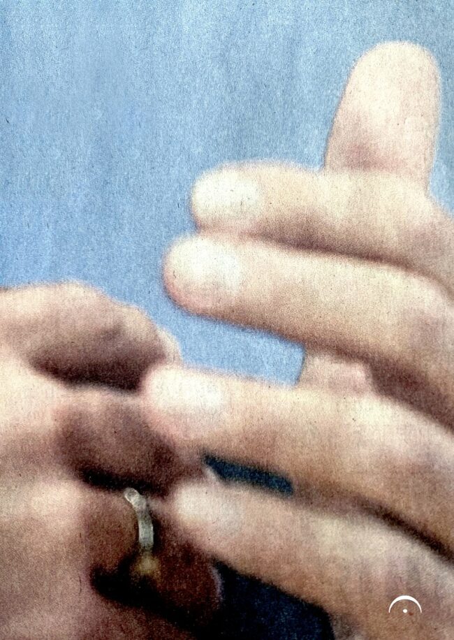 L. S.: We should talk about the title of that work in that passage. It’s called »Fermata«. »Fermata« is a musical term. On a chart it indicates a moment of freedom for the performer. The performer can improvise in that notated spot. You can cut loose and hold the note, pull the cord, not do anything. It’s freedom, it’s self-expression. We liked the kind of analogy of what that represents. In this moment of a war in Ukraine, of a public health crisis, etcetera, this idea of a pause and freedom resonates. So, we called this piece »Fermata«. Lee works with that from a sonic point of view and I work with that idea from a visual point of view. I’ve created things that I’ve garnered from daily newspapers, mainly Austrian newspapers, where I was re-photographing people’s hands. Seven poster images display hand gestures. Some suggest power, some suggest submission. You can read what you like into these very slight gestures, but it is communication with your hands. As a pause or freeze frame it relates to the idea of »Fermata«.