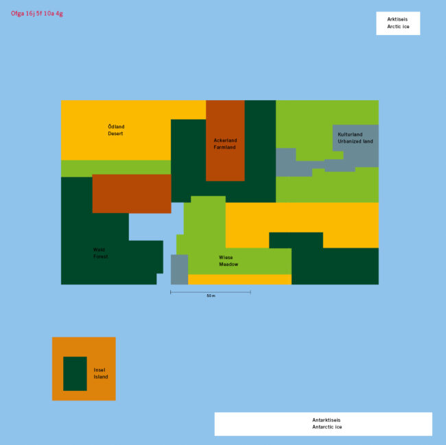 Das erste Beispiel für die Visualisierung einer alternativen Welt ist Manuela Pfrunders Atlas »Neotopia«, der eine Welt mit radikal gleichmäßiger Verteilung zeigt. Die darin enthaltenen Karten beschreiben eine Welt, in der alle Menschen den gleichen Zugang zu Wasser, Bergen, Wäldern, Wiesen, urbanisiertem Land und weiterem hätten. Pfrunder belässt es aber nicht bloß hierbei, sondern geht weit über geografische Aspekte hinaus. Sie zeigt beispielsweise auch, was es bedeuten würde, wenn Ressourcen wie Kaffee, Kakao, Käse, Zucker, Fisch, Fleisch etc. gleich verteilt wären. Sie geht sogar so weit, sich eine gleichmäßige Verteilung von menschlichem Leid wie Hunger oder politischer Verfolgung vorzustellen. »Neotopia« ist eine entschiedene Kritik an den bestehenden Ungleichheiten in unserer heutigen Welt in Form eines Atlas. Sie macht eine alternative Realität mittels Kartografie, also der Visualisierung räumlicher Verhältnisse, verständlich. Pfrunders Arbeit ist daher ein wunderbares Beispiel für die Visualisierungsstrategie »Planzeichnung«, ein besonders hilfreicher Ansatz, sobald es darum geht, eine Welt basierend auf konkreten Zahlenwerte zu visualisieren.