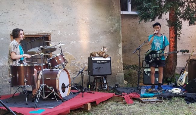 Doch weiter zur Musik: Pete Prisons Bosna, in aktueller Besetzung mit Dora Dancer an den Drums, aber immer mit Wiener Würstelstand Blues, eröffnen Open Air im Hinterhof der Location Alte Nähstube die Festival-Tour. Voller Gitarrenklang, jazzy Fender galore, Drums on-point machen alle im Publikum rhythmisiert und froh: Endlich wieder Sound- und Sonnenbaden! Vor der Zugabe das übliche Stück mit Wählscheibentelefon als Mikro. Delicious!