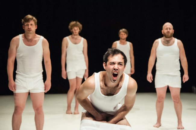 Dementsprechend ist es nur recht, wenn »Die wunderbare Zerstörung des Mannes« ausgerufen wird. Reichlich spät, aber Vergeltung ist bekanntlich süß und zeitlos. Zerstörung klingt übrigens nur zufällig nach Krieg – und in diesem kriegerischen Grundzustand befindet sich der Mann aus Gründen der Natur. Uga, uga, uga! Es ist ein Krieg ohne Waffen gegen niemand anderen als sich selbst. Sozusagen eine Ein-Mann-Operation mit sechs Gesichtern, die das aktionstheater ensemble nun mit ihren eigenen, zugegebenermaßen bewährten, aber überaus erfolgreichen Mitteln ausficht. Am Anfang steht dort ein Kreis. Und in diesem Kreis stehen Männer. Sie heißen Andreas oder Thomas. Ein anderer heißt Peter. Aber das tut nichts zur Sache. Was sie alle verbindet, ist die einfache Tatsache, dass sie Männer sind. Im Geiste verbunden stehen sie aufgefädelt im Raum, etwas ratlos, ohne Frage. Belehrt wird natürlich bitteschön trotzdem. Wer keine Ahnung hat, der sagt einfach irgendwas, was soll dabei schon schiefgehen? So haben sie es gelernt, so wurde es ihnen gezeigt, den nach Anerkennung und Bestätigung lechzenden Männern. »Ich habe dich unterbrochen? Nein, das kann nicht sein!« Fünf Männer also, die ein Bild des Mannes symbolisieren. Dazu noch ein Abtrünniger! Denn ganz so einfach wie der anfängliche Einklang hegemonialer Männlichkeit es verspricht, ist es nicht.