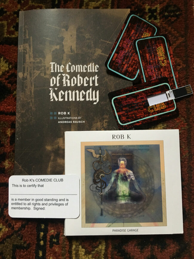 Egal, zur Sache: »The Comedie of Robert Kennedy« umfasst im Gesamtpaket drei CDs mit insgesamt über drei Stunden Musik, ein Buch (mit den Lyrics zu allen Songs und Illustrationen von Andreas Rausch, die den cut-up/mixed-mediaCharakter der Musik sehr gut einfangen) und einen USB-Stick mit dem Material der drei CDs plus Bonus-Material. Viel Holz. Dramaturgisch angelehnt, wie im Titel leicht erkennbar, an Dantes »Göttliche Komödie« versammelt die Veröffentlichung Musik, die über einen Zeitraum von mehr als dreißig Jahren entstand. Stilistisch eine kleinteilige und kurzweilige (manchmal auch anstrengende) cut-up Rock’n’Roll-Nummernrevue unter Beteiligung von mehr als hundert Musiker*innen (überwiegend Protagonist*innen der oben genannten Szene wie Bob Bert, Jim Waters, Dan Brown, Hollis Queens, Jack Martin, Jerry Teel, natürlich auch Jon Spencer und Christina Martinez, Workdogs-Kollege Scott Jarvis, Marcellus Hall, Don Howland, Dan Kroha und, und, und). Erschienen ist das Ganze in Eigenregie von Kennedy, der das Projekt auch auf eigentümliche Weise im Rahmen eines Membership-Programms vermarktet. Spotify? Pustekuchen! Die erste CD enthält eine überarbeitete Version der bereits 1993 erschienenen »Workdogs In Hell«–Aufnahmen, die zweite titelt »Purgatory Home Companion«, die dritte »Paradise Garage«. Hölle, Läuterung, Paradies. Ein Stufenmodell hin zur Erlösung, musikalisch nachvollzogen aus der Perspektive eines wortmächtigen Underground-Rock’n’Rollers.