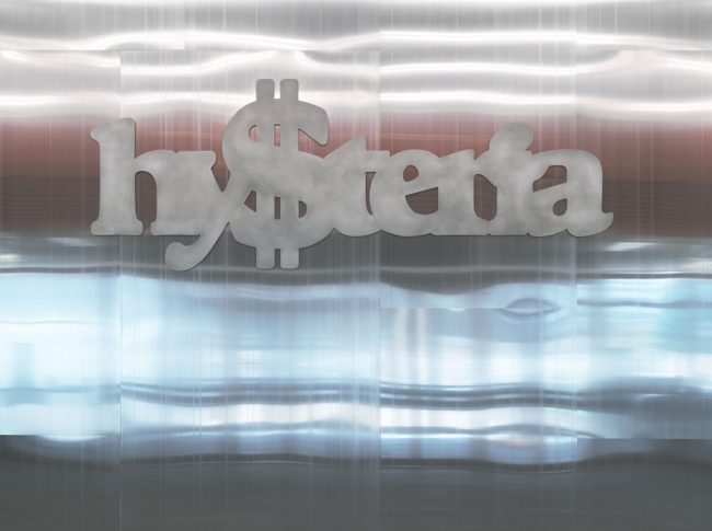 Oft verwendet Bonvicini Text als künstlerische Ausdrucksform. Beispielsweise ließ sie während ihres Aufenthaltes in Los Angeles das Wort »Desire« auf eine Shopping Mall setzen. In der aktuellen Ausstellung ist das Wort »Hysteria« auf der Wandfassade ihrer Arbeit zu sehen. Hysterie, griechischen Ursprungs, bedeutet Gebärmutter und ist vor allem durch Sigmund Freud und seiner Pathologie der Hysterie als Frauenkrankheit konnotiert. Im Kontext der Arbeiten von Bonvicini lässt das Wort an die Hysterie des Kunstmarktes denken, an die Hysterie der Medien, an den Kapitalismus, an den dies gekoppelt ist.