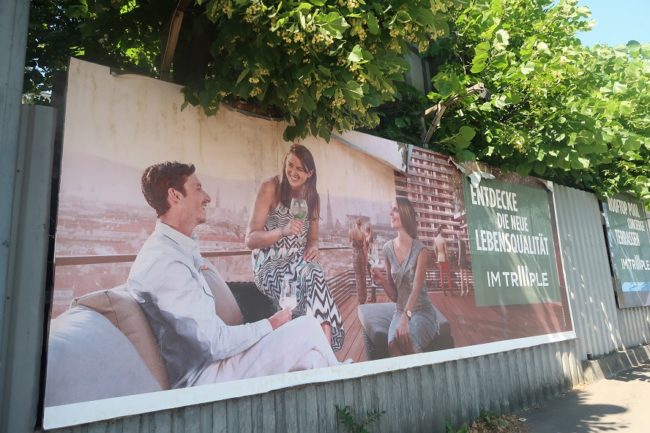 »Wo wir uns finden, wohl unter Linden«. Etwas stocksteif genießen die Endverbraucher*innen ihr neues Leben auf der Terrasse. Sie haben Aussicht auf jene Stadt, in die hinabzusteigen sie nicht mehr gezwungen sind. Die Natur wird den Kampf gegen die Plakatwand gewinnen, aber nicht jenen gegen den Beton.