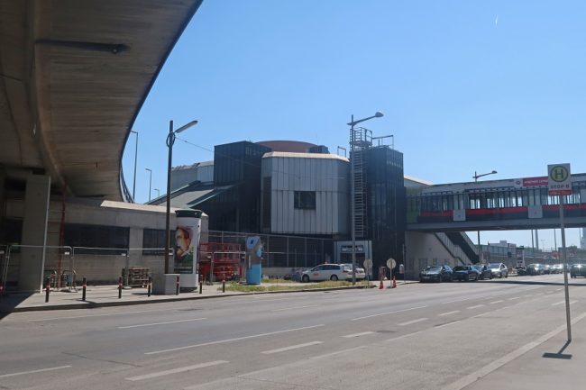 Wer genau hinschaut, erkennt, dass das Hochhaus seinen glänzenden Sockel über einem anderen, älteren Gebäude errichtet hat. So geht Hochstapelbau. Einfach noch eines obendrauf. Davor im Schatten jener Würstelstand, der am Salon gegrillte Stärkung liefert.