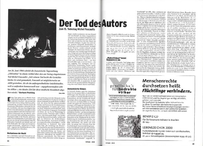 30 Jahre skug sind auch Reflexion über einstige skug-Autor*innen, deren herausragende Texte über damalige Redakteur*innen wie Roland Schöny zu skug gelangten. Ö1-Journalist Gerhard Pretting, leider 2014 im 46. Lebensjahr verstorben, hat skug eine zentrale Würdigung des Werks von Michel Foucault zu verdanken. Der französische Philosoph, Historiker, Soziologe und Psychologe, der insbesondere auch den aus der Gesellschaft Ausgegrenzten seine Aufmerksamkeit schenkte, stellte nicht nur die Frage nach der Diskurshegemonie (wer definiert den »wahren« Diskurs?), sondern hat die Antwort auf viele Fragen vorweggenommen. Das Fiese am komplexen Finanzkapitalismus ist, dass er als System dem Menschen die Schuld für sein Versagen zuweist. Foucault erkannte früh, dass Machtsysteme, auch wenn sie sich demokratisch geben, kaum freien Willen zulassen, auch wenn zu viele Menschen das glauben mögen. Das Coronavirus hat dem hoffentlich entgegengewirkt und klar ist, dass angesichts der COVID-19-Disziplinierung der Menschheit gern aus Foucaults Meisterwerk »Überwachen und Strafen« zitiert wird. Die scheinbar freien Gestaltungsmöglichkeiten für das »freie« Individuum verschleiern nur den Blick auf das wahre Ausmaß der Disziplinierung der Gesellschaft. Der Raum jenseits der Macht wird immer enger …
