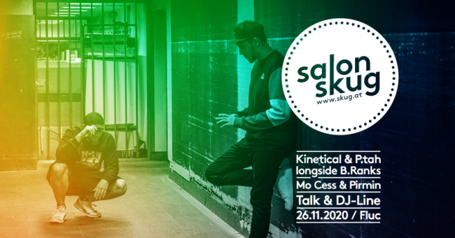 Unser HipHop-Salon mit Kinetical & P.tah longside B.Ranks (Duzz Down San) und Support von Mo Cess & Pirmin (Da Kessl) war ursprünglich im März 2020 geplant und musste – aus Gründen – leider abgesagt werden. Umso mehr freuen wir uns, diesen Termin am Donnerstag, dem 26. November im Fluc nachzuholen – mit neuem Album im Gepäck! Die MC-Veteranen Kinetical und P.tah machen Grime mit deutschen und englischen Raps und verbinden Versatzstücke aus Dub, Garage und Dancehall zu einem energetischen Mix, an den Decks begleitet von Langzeitpartner B.Ranks. Davor sind Mo Cess & Pirmin aus dem Tiroler Landeck mit Mundartraps zugange, teils mit fantastisch ethnomusikalischem Einschlag. Features gibt’s in Form eines skug Talks sowie der skug DJ-Line. Wie immer sind 50 Sitzplätze in der Wanne verfügbar, Eintritt frei, Spende erbeten. Whoop Whoop!