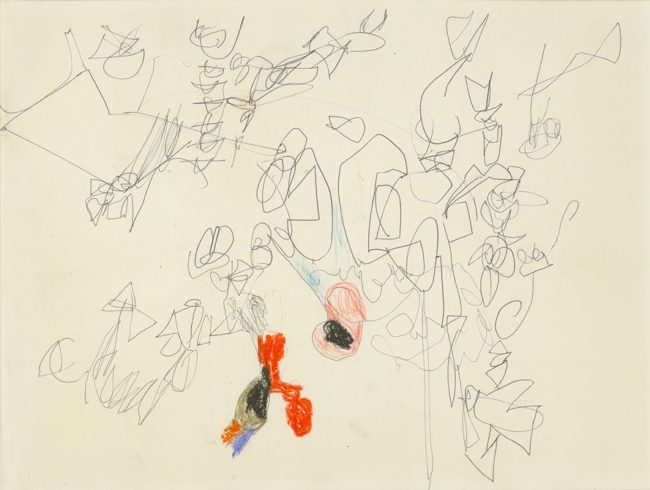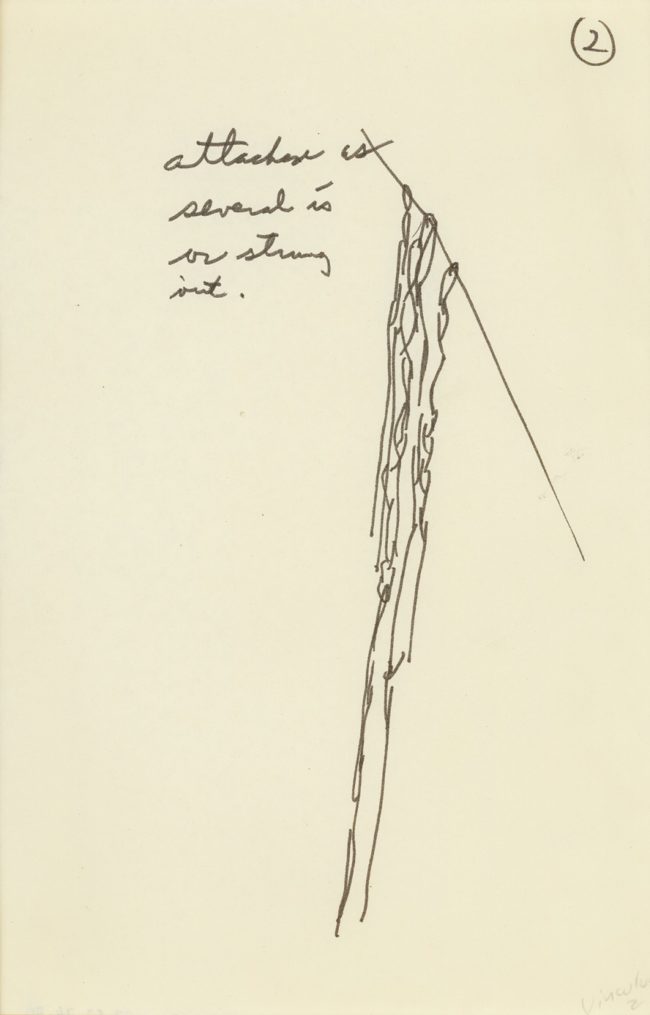 Ihr Ehemann, der Bildhauer Tom Doyle, wurde von einem deutschen Fabrikanten nach Kettwig an der Ruhr bei Essen eingeladen. Eva Hesse begleitete ihn und fand in der aufgelassenen Weberei der Textilfabrik Scheidt Unmengen an Schnur. Sie arbeitete mit deutschen Kindern an »crazy, wild forms», malte deren Zeichnungen nach und befreite sozusagen das Kind in sich. Sie bezeichnete ihre Zeichnungen als »adult’s children drawing«. In ihr Tagebuch schrieb sie: »If crazy forms, do them outright. I’ll show myself another form.« Sie nannte das Nachzeichnen der Kinderzeichnungen »playacting«. Dadurch kam sie auf ihre Sehnsucht nach einem Möglichkeitsraum – »the desire for the space of possibility«, einer Eroberung des (Sicherheits-)Raumes.
