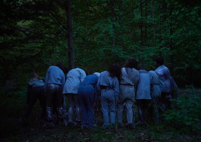 Peter Jakober hatte bei der Regisseurin Anna Viebrock mit Bühnenbildstudent*innen ein Orgelpfeifenstück in der Akademie der Bildenden Künste gemacht. Ich habe diese Arbeiten im Semperdepot gesehen und ihn eingeladen, eine Komposition für »Oracle and Sacrifice in the Woods« zu konzipieren, weil mich diese metallische Verlängerung des Atems als Klang total interessiert hat. Diese Beatmung des Waldes, die seine Komposition darstellt, konnte ich dann durch die einzelnen Personen des Chors choreografisch verräumlichen. Diese klanglich-rhythmischen Interventionen werden zu einer akustischen Vermessung dieser Landschaft. Und dann in der Dunkelheit des Abends verschwinden.