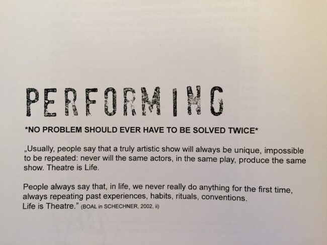 Als experimenteller Zugriff auf den öffentlichen Raum äußert sich Freiraum-Hacking primär performativ, das heißt, es realisiert sich über seine eigene Praxis. »Im Cultural Hacking wird einerseits Kunst als Wissenschaft betrieben, und andererseits orientiert sich Wissenschaft an Kunst bzw. Poesie und deren Erscheinungs- bzw. Inszenierungsformen.« (Düllo) Bei den unterschiedlichen Formen des Freiraum-Hackings verschwinden die Grenzen zwischen wissenschaftlicher Forschung und künstlerisch-kreativen Praktiken und es »ist nicht zuletzt auch gleichbedeutend mit Performance und Interaktion«. (Düllo)
