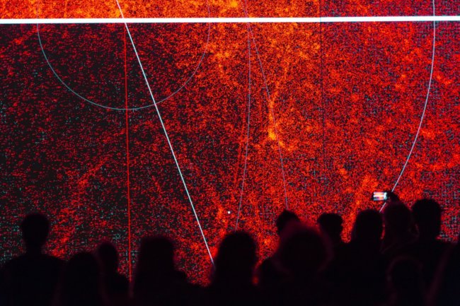 Wir nehmen Platz in der Infosphäre. Immer schneller werdende Reihen an Datenmaterialien rauschen unablässig an uns vorbei, lassen uns – stehend oder liegend – Teil von ihnen werden. Ein immersives Erlebnis in einer augenscheinlichen Entropie, die doch gänzlich rationalen Regeln folgt und von den klanglichen Idealen des japanischen Künstlers profitiert. Ikeda, inspiriert von einem Aufenthalt am Genfer CERN, stellt nämlich die richtige und wichtige Frage: Wie stellen wir uns die Datenwelt vor? Muss sie einer ästhetischen, menschgemachten Vorstellung genügen, um als solche wahrgenommen zu werden? Was stellt sich der Mensch überhaupt unter Daten vor? Er bietet dafür eine – seine ganz persönliche – Antwort und versteht es, die Kluft zwischen theoretischem Verständnis und menschlicher Erfahrung durch künstlerische Vorstellungskraft zu überbrücken. Von kleinsten Teilchen zum ungreifbaren Ganzen. Schließlich wissen wir etwas, das wir nicht absolut darstellen können, während wir gleichzeitig etwas darstellen, das wir uns nicht vorstellen können.