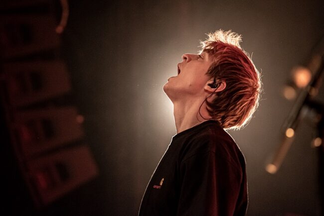 Der Grund: Schmyt ist einer dieser Musiker*innen, auf die sich fast alle einigen können. Bei ihm trifft Singer-Songwriting auf HipHop, gebrochenes Herz auf Gesellschaftskritik, Humor auf Melancholie. Als Label hängt ihm derzeit noch letzteres an, schließlich vereinte seine erste EP 2021 auch eher Seelenschmerz-Drogensumpf-Songs wie »Poseidon«, »Gift« oder »Taximann«. Und als Schmyt einmal scherzhaft in die Runde fragt: »Wer ist nur für den Depri-Shit hier?«,recken auch alle ihre Hände in die Luft. Bei seinen clubbigen, mitreißendenTracks – darunter »Sterbenstaub« feat. RIN, »Tangobounce Freestyle« oder »100 Euro« – tanzt die Crowd aber trotzdem wild mit.