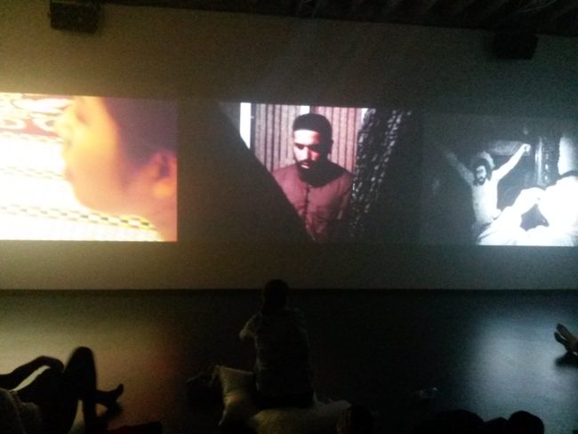 Dem Eröffnungskonzert kommt innerhalb des Festivals eine besondere Rolle zu, da dort die Geldgeber*innen, Kooperationspartner*innen, Presse und für das Festival wichtige Personen eingeladen sind. Auch soll es exemplarisch das Festivalthema vermitteln. Moon wurde von Co-Kurator Rabih Beaini eingeladen (Moon hatte in der Vergangenheit für Beaini einige Videos produziert), welcher im zweiten Teil des Abends ein Konzert mit Ensemble präsentierte. Moons Event wurde als »lecture and screening« eines »transmedia« Projekts angekündigt (CTM website 2016, opening). Weiter heißt es in der Ankündigung: »Moon explores what people who didn’t break their connection with planet earth, or are going back to that connection, have to tell us as a new way of living together« (ebd.). »Híbridos« wird als »cine-trance of emotions« beschrieben. Dabei wurden Live-Sequenzen aus einem bis dahin unveröffentlichten Werk – dem Film »Híbridos« (2018) – zusammengestellt und projiziert. In dem Film stellen die beiden Produzent*innen Vincent Moon und Priscilla Telmon oberflächlich betrachtet die verschiedenen religiösen und spirituellen Praktiken in Brasilien, vom Katholizismus und evangelischen Sekten zu indigenen Ritualen über Ayahuasca Zeremonien bis hin zu Kulten wie Umbanda und Candomblé, dar. Die CTM Website versprach ein Portrait des gegenwärtigen Brasilien »as a laboratory of cultures« (CTM 2016, opening).