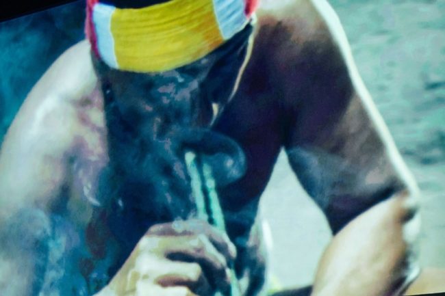 Die angekündigte Lecture gab es nicht, stattdessen hatte Moon eine sehr knappe Anmoderation gemacht, dass es um Spiritualität in Brasilien ginge und wie spirituell es in Brasilien sei und dass er eigentlich nichts weiter dazu sagen wolle, da die Bilder für sich sprechen sollten. Auf mich wirkten die Bilder aber extrem exotisierend, denn zu sehen war ein wildes Potpourri aus Ritualen, Praktiken und Zeremonien, inklusive Sinnsuchenden, die sich nackt und vor Ekstase stöhnend im Schlamm wälzen. Einen Zusammenhang zur Musik, zu jener, für die CTM eigentlich steht (elektronisch/experimentell), konnte ich nicht ausmachen. Die Musik bildeten oftmals Gesänge oder minimalistische Rhythmen von Instrumenten, welche diese Rituale begleiteten. Die Klänge und Gesänge wurden in meinem Empfinden durch die extreme Bildmacht komplett in den Hintergrund gedrängt, ein Problem, das oft bei audio-visuellen Darstellungen auftritt. Auch konnte die Musik die perpetuierten Klischees und Stereotypen nicht brechen, sondern untermalte oder untermauerte diese. Brasilianer*innen mit Drum Computern, Synthesizern oder Echo-Dubs gab es nicht. Neben kollektiven Gesängen sah man häufig dunkelhäutige oftmals halb nackte Gottes- oder Geisteranbeter*innen mit Rasseln, Trommeln und anderen traditionellen Instrumenten. Obschon auch Instrumente bei den Avantgarde-Festivals zum Einsatz kommen, ist elektronische Klangerzeugung eher die Regel beim CTM Festival.