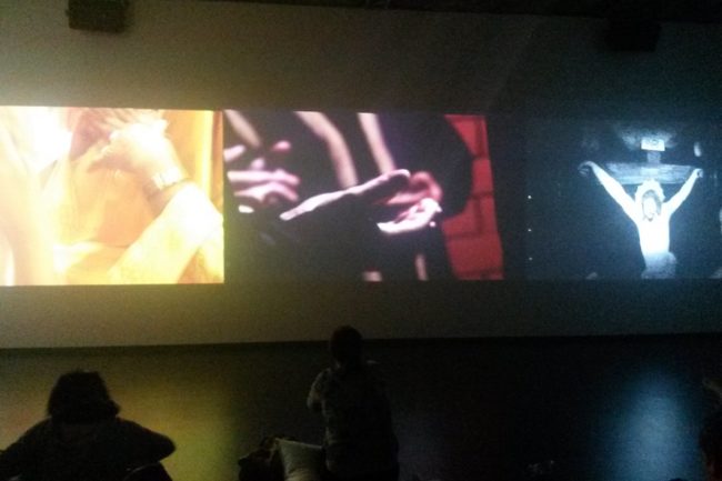 Moon hatte darüber hinaus im Auftrag von CTM eine Installation mit dem Namen »Rituals« für CTM angefertigt, die während des ganzen Festivals zu sehen war, welche auch nicht frei von den oben genannten Problematiken war. Die Installation wurde auf der Website wie folgt beschrieben: »Rituals enlaces themes of timeworn trance rituals and the sacred in modern life into a synthesis of new findings« (CTM 2016, rituals). Die Leistung dieser Synthese wurde vor allem den Betrachter*innen selbst überlassen, da es lediglich Videoaufnahmen auf drei gleichzeitig bespielten Bildschirmen ohne weitere Informationen zu sehen gab. Darüber hinaus wurden diesmal Rituale aus ganz unterschiedlichen Ländern, Regionen und Kontexten im Random-Modus zusammengewürfelt.