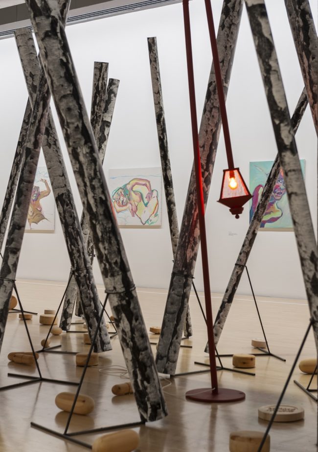 Das gezeichnete Alter Ego von Maria Lassnig zieht mit einem grünen Handschuh ihr Auge aus der Augenhöhle heraus. »Materialisation des Auges« (ohne Jahrgang) heißt das Bild. Auf dem nächsten Bild hält diese nackte Figur ihr Auge hoch über sich mit zwei Händen. Muskeln, Busen. Ihre Augenhöhlen sind geschlossen. »Das Optische Zeitalter« (1985/86), ist der Titel. Gegenüber stehen die Stämme eines Birkenwaldes mit Lampen, deren hängende Oberteile rote Lichtpunkte aussenden. Ständig wird man an Brainspotting erinnert, eine Therapiemethode, die sich auf die angeblich hinter den Augen gespeicherten Schmerzpunkte konzentriert und über die Augen behandelt. Ressourcenpunkte gibt es auch.