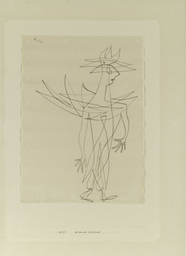 Humor scheint Klee auf jeden Fall gehabt zu haben. Seine Figur »Geht kaum mehr, fliegt noch nicht« (1927) sieht wie ein abgestürzter, angefressener Künstlerkönig aus und ist mit einem Strich durchgezeichnet. Gerade dass der nicht Steine kickt. Klee nahm sich selbst als Künstler auf die Schaufel und verhinderte auf diese Weise jedes Transzendenzdenken. Er wollte sich nicht für die Ewigkeit verewigen und keinesfalls sein tolles »Künstler-Ich« feiern. »Die Sehnsucht nach Transzendenz verwandelt er in Allegorien des tragikomischen modernen Künstlers und seines heiter-melancholischen Bewusstseins«, steht an der Wand. So wie manche BesucherInnen schubsen, scheinen sie enttäuscht vom Mangel an Transzendenz und Selbstverewigung, die sie gerne für sich alleine einfangen und besitzen würden? »Ich war ja dort, wo der Anfang ist«, schrieb Paul Klee, »bei meiner angebeteten Madame Urzelle.«