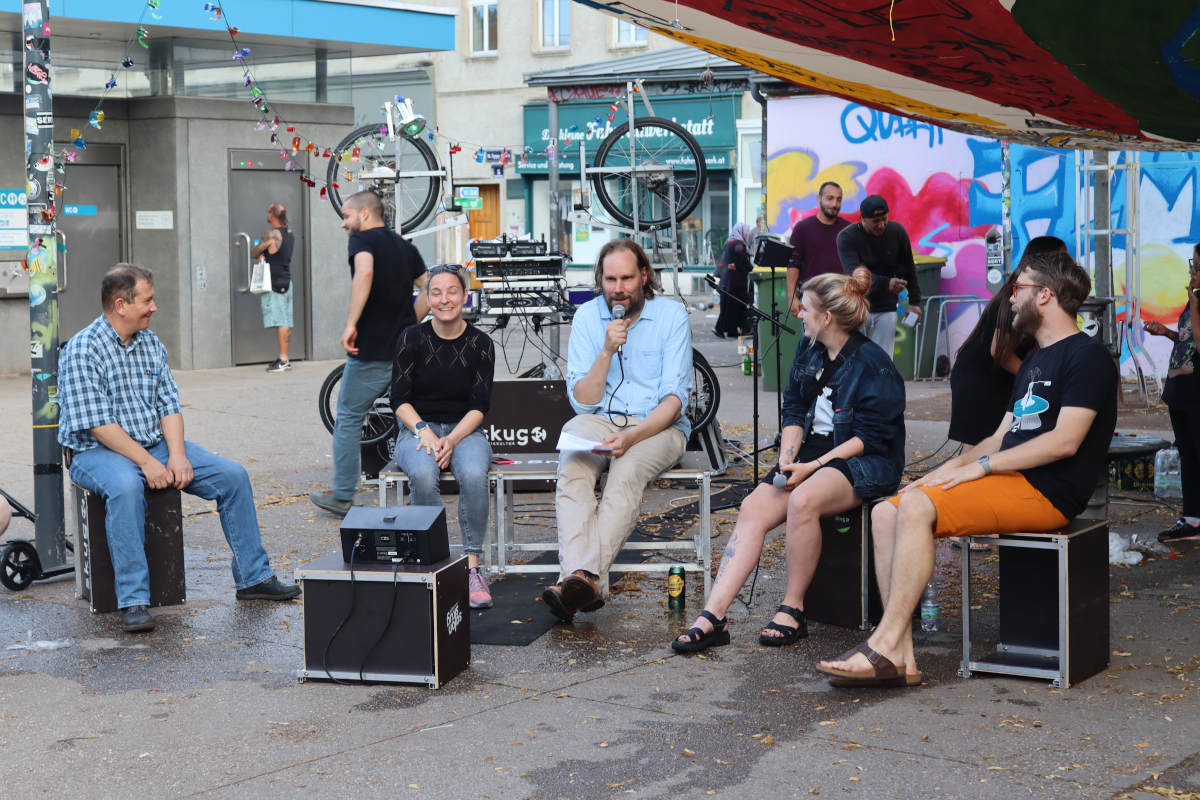 Es diskutierten Roland Romano, Sprecher der Radlobby Österreich; Martin Winkelbauer, Verkehrssicherheitsexperte und Gutachter; Luise Wernisch-Liebich, Zukunftsrat Verkehr; Philipp Haller, Künstler und Historiker. Moderation: Ania Gleich (skug) und Frank Jödicke (skug), Ton: Khachick Danho.
