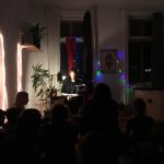 Tausend Bilder sagen bekanntlich mehr als ein Wort von skug. Weil wir uns in der Redaktion nicht darauf einigen konnten, ob das Wort für unsere vier bisherigen Salons des Jahres 2019 »apart« oder »bizarr« ist, liefern wir einmal den fotografischen Überblick und überlassen den Leser*innen die Entscheidung. Eines darf für jene festgehalten werden, die bei den Salons nicht dabei sein konnten: Wenn in einer dieser 1990er-Jahre-US-Sitcoms wie »Friends« oder »Roxanne« einmal wilder New Yorker Avantgarde-Underground porträtiert wurde, dann sah das immer aus wie ein Salon skug. Im Salon werden bei Kerzenschein und Bühnennebel Platten aufgelegt, Horrorfilmcollagen abgespielt und einer der Musiker tritt als Außerirdischer verkleidet auf (Low Profiler und DVRST, 11.4. im AU), da wird elektronisch verzerrte Zugposaune gespielt und die filmisch festgehaltenen Erlebnisse eines psychedelischen Froschs werden mit Orgelmusik unterlegt (MAG und Laughing Eye, 9.3. im rhiz), da wird in einer leerstehenden Wohnung Blockparty abgehalten und die Lesungen werden in die einzelnen Zimmer übertragen, weil in einem Raum das interessierte Publikum nicht genügend Platz findet (Salon skug intim, 26.2. in Währing), da spielt einer ein komplettes Konzert Schlagzeugsolo und man hat den Eindruck, ein Symphonieorchester zu hören (MOTHERDRUM, 15.1. im AU). Den Artists und Venues sei an dieser Stelle noch kurz der gebührende Dank ausgesprochen.