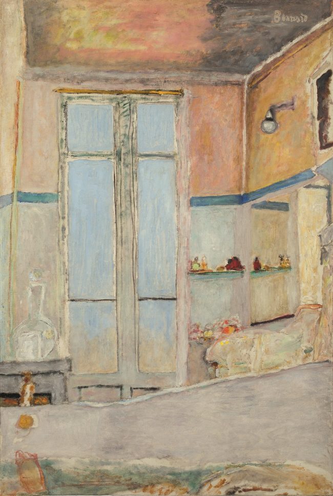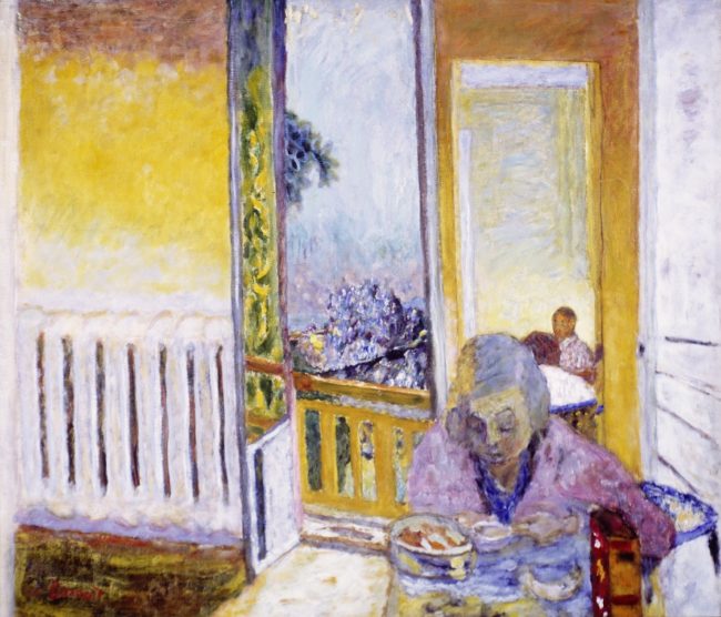 Bonnard stand im Briefwechsel mit Henri Matisse, der ihn als Maler posthum gegen Kritiker*innen verteidigte. Er verwendete ähnlich wie Matisse oft das Motiv Fenster. Doch seine Fenster sind alltäglicher und dienen nicht so sehr der Dekoration, sie weisen nach außen, auf mögliche Fluchtlinien hin, nicht in den Innenraum hinein wie bei Matisse. Die Farbe war Bonnard laut Kunstforum-Katalog wichtiger als das Motiv, deswegen malte er auch aus der Erinnerung. Im Ersten Weltkrieg war Bonnard noch einer der Maler, die dokumentarisch arbeiteten, das Grauen festhielten. Er malte »die Häuser erdfarben wie das Schlachtfeld selbst«. Sein Vater Eugen Bonnard arbeitete als Bürochef im Kriegsministerium. Vielleicht erklärt dieser Umstand Bonnards Zurückhaltung, obwohl er schon im Ersten Weltkrieg zu alt war, um eingezogen zu werden. Im Gegensatz zu Matisse, der sich 1916 mehrmals freiwillig meldete, tat Bonnard das nie. Ein bekanntes Selbstporträt des Künstlers heißt »Le Boxeur«/»Der Boxer« (1931) und zeigt ein kleines buntes Bild im Bild, über seiner roten Faust. Das verzerrte Gesicht rotbraun, der Körper weiß. Seitlich ein Streifen Blau.