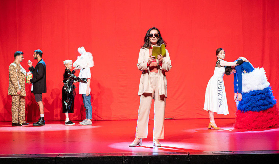 Dagegen zeigt das georgische Duo Keti Chukhorov (Text) und Guram Matskhonashvili (Regie) mit »The Global Congress of Post-Prostitution«, wie man mit einfachen Mitteln sehr geschickt mit Raum umgehen kann. In einem vergleichsweise klassischen Setting – Bühne, Saal und Balkon – erschließen die Schauspieler*innen den Raum nach und nach: So ragen zu Beginn nur zwei Beine unter dem geschlossenem Bühnenvorhang hervor, während gegen Ende selbst die technische Ausstattung des Hauses in die Handlung miteinbezogen wird. Nun mag dieser Ansatz zwar nicht unbedingt neu sein, er ermöglicht es aber der Choreographin Lana Kavrelishvili, das Geschehen auf der Bühne regelmäßig zu verlagern, um damit die Charaktere auf vielschichtige Art und Weise in Beziehung zu setzen. Eine besondere Rolle kommt dabei dem Einsatz von Licht und Sprache zu. So übernimmt die Monitorwand am rechten Bühnenrand, auf welchem dem Publikum erst die russischen Textpassagen auf Englisch übersetzt werden, später die Funktion eines Hintergrundes für Schattenspiele. Die Texte des Stücks, eine mit Sarkasmus und demonstrativer Scheinheiligkeit gewürzte Tour de Force durch die Untiefen kritischer Theorie, wechseln zwischen keineswegs akzentfreiem Englisch, Russisch und eingespieltem Hochdeutsch (unter einer Maske). Dazwischen gibt es viel Glitter, Selfies und Drama, welche dem Stück trotz Mord und Totschlag eine fulminante Leichtigkeit verleihen.