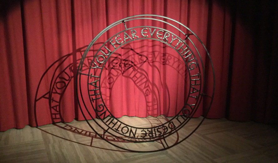 Als Kontrast zu Deller widmet sich die Ausstellung im Untergeschoss den Druckgrafiken von Ian Hamilton Finlay. Bis zu seinem Tod im Jahr 2006 arbeitete der schottische Künstler an einer großräumigen, von konzeptuellen und bildhauerischen Werken durchzogenen Garteninstallation namens »Little Sparta«, rund vierzig Kilometer südwestlich von Edinburgh, dem »Athen des Nordens«. Seine vielfältigen Textarbeiten zeigen dabei eine Nähe etwa zur onomatopoetischen Poesie von Ernst Jandl, mit dem Finlay ab den 1960er-Jahren im Austausch stand. Es ist daher auch kein Zufall, dass sich sein Gedicht »all alone« auf Olaf Nikolais Deserteurdenkmal am Wiener Ballhausplatz wiederfindet1. Als Bindeglied zwischen Finlay und Deller fungiert der Beitrag von Jasmina Cibic, deren Arbeiten sich um das Thema des kulturellen Kolonialismus drehen. Während sich der Zugang zu ihren Videos als vergleichsweise mühsam erweist, illustriert die von der in London lebenden Slowenin ausgestellte Metallskulptur die Idee des trojanischen Pferdes mit einem sprachlichen Kniff: in der Inschrift »NOTHING THAT YOU FEAR / EVERTHING THAT YOU DESIRE« verstecken sich auch die Fragmente »YOU FEAR EVERTHING / YOU DESIRE NOTHING« (siehe Abbildung), womit Cibic die Schizophrenie des populistischen Nationalismus zum Ausdruck bringt.