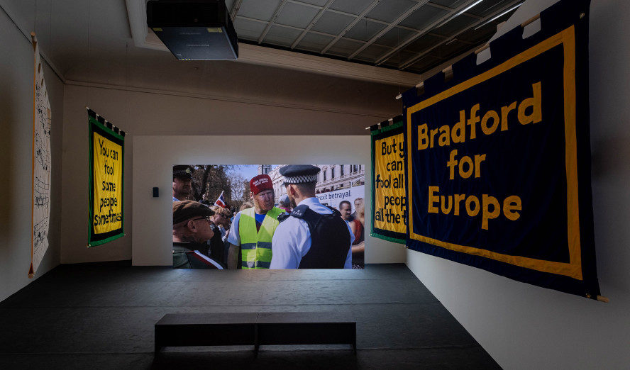 Wer einmal, um sich einen Überblick zu verschaffen, die Hürde des über 300 Seiten starken Programmhefts genommen hat, dem eröffnet sich beim Steirischen Herbst 2019 ein vielschichtiges und hochpolitisches Programm mit Schwerpunkt auf performativen Arbeiten und Videoinstallationen. Erfrischend wirkt dabei die Ausgewogenheit aus lokalen und internationalen Beiträgen, die gemeinsam einen europäischen Kulturraum umreißen, der vom Atlantik bis zum Schwarzen Meer reicht. Mit seiner Videoinstallation »Putin’s Happy« (2019) stemmt sich Jeremy Deller im Künstlerhaus gegen Bestrebungen, die westlichen Ausläufer dieses Raumes abzutrennen. Dafür sprach er mit Befürworter*innen und Gegner*innen des Brexit, setzt deren Argumente und Ansichten in Beziehung zueinander und kommentiert diese mit großformatigen Stickarbeiten, welche Ästhetik und Slogans der Transparente der Gegner*innen aufgreifen.