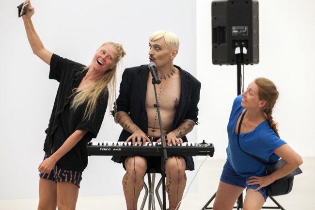 Ivo Dimchev betritt den Raum im Untergeschoß des Leopoldmuseums mit einer Tasche voller Perücken und Blumengirlanden, geht singend mit Mikrophon und Smartphone ins Publikum, um sich und dieses zu fotografieren und zu filmen. Vor dem zweiten Song, ein Keybord auf den Oberschenkeln, stellt er klar, dass er sofort zu singen aufhört, wenn nicht mindestens drei Menschen ein Selfie mit ihm machen. Es gibt ungefähr drei Singpausen in dieser Stunde, das Publikum ist überaus aufmerksam und unterstützend. Und da ist sie, diese großartige Stimme, die in und aus seinem präsenten Körper tönt. Seine poetischen Lyrics in seinen musikalisch komplexen Liedern erfüllen den Raum: »I-Cure«, »Travelling Light«, »Lucky Day«, »Raise Me«, »Rain« und neue Lieder. Ein wunderbares Konzert, das eine bessere Tonakustik verdient hätte – irgendwann, hoffentlich in baldiger Zukunft, wird Ivo Dimchev im großen Saal des Konzerthauses singen– und wir werden dort sein!