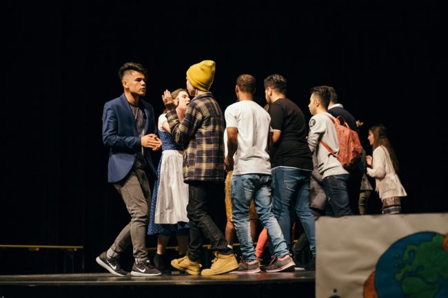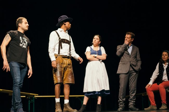 Die Flüchtlinge schauen seitlich hinter der Kulisse heraus. »Ich hoffe mal, dass das nur eine Ironie des Schicksals ist«, hört man. Oder: »Rechtsstaat. Warum nicht Linksstaat?« Der vierzehnjährige Milan zieht die Flüchtlinge mit seiner Spielfreude mit. »Wir wollen keine Grenzen. Nationale Sicherheit, bedeutet das internationale Unsicherheit?« Die Rollen sind oft gegengleich besetzt, also die rechtsrechte Gang hat mit Romeo (Mostafa aus Afghanistan) einen Flüchtling als Anführer. Ausländerfeindliche Phrasen klingen in gebrochenem Deutsch noch seltsamer. »Heimat ist dort, wo du gewohnt bist zu sein. Auch wenn es ein dunkler Graben ist«, sagt eine Slowenin.