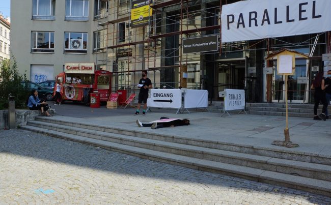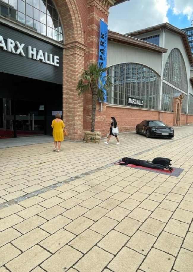 Die Durchlässigkeit und damit auch Wandelbarkeit der Deutung und Bedeutung ist für mich in diesem Zusammenhang am interessantesten. Wer hat die Deutungshoheit über ein Werk, über eine*n Künstler*in, wer entscheidet über Relevanz oder Bedeutungslosigkeit, über monetären, fünf- oder sechsstelligen Wert oder Wertlosigkeit. Durch das Liegen ergibt sich eine Irritation des Blickes der vertikalen Position auf die Horizontale. Rein perspektivisch betrachtet, schaut man in diesem Fall auf mich, die Künstlerin und ihr Werk, herab, muss gegebenenfalls über mich drübersteigen, kann über mich hinwegsehen, mich (willentlich) übersehen oder sogar, wie zuletzt, überfahren (womit ich natürlich nicht gerechnet habe). Die Reaktionen sind vielfältig – von der Empörung über das ungefragte künstlerische Statement und die Androhung einer polizeilichen Platzverweisung über ehrliche Sorge um mein Wohlbefinden und Hilfsangebote bis hin zu amüsierter und interessierter Rezeption. Dieses Liegen, wie vom eigenen Werk begraben oder erschlagen, ist ja durchaus auch humorvoll gemeint, mit einem Seitenhieb auf das geschäftige, gewichtige Gewusel rund um solche Veranstaltungen und das sich selbst und sein Werk für unabdingbar, unabkömmlich und absolut halten. Was das Überfahren betrifft, so führt es im Grunde in einem verstärkten und fataleren Sinn Macht und Ohnmacht und die Zerbrechlichkeit des menschlichen Körpers und Seins vor Augen in Anbetracht einer übermächtig gewordenen Mechanisierung und Kapitalisierung.