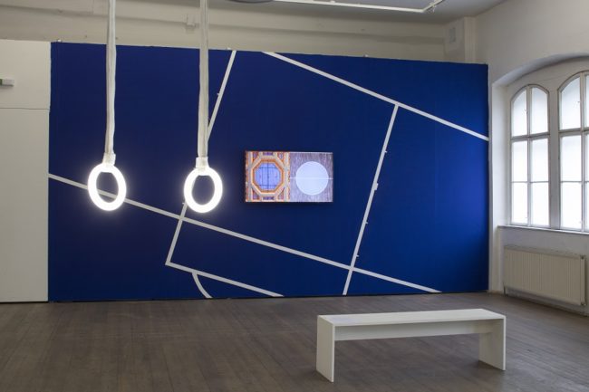 Sportliche Jungs, die ringen. Jungs, die singen und jubeln. Ein verziertes, rundes Fenster, darunter der Kreis aus geflochtener Kordel des Basketballkorbes mit seinen Schnüren. Olson Lamai zeigt in seinem Film »Magic Palace« (2018) eine alte Kirche in Shkodra in Albanien, die in eine Sportstätte verwandelt wurde. Er verweist auf die Ähnlichkeiten der alten und der neuen Inszenierung. Am Boden und am hölzernen Plafond ähneln sich das Ornamentale und die Kreismotive sehr und sind zum Teil sogar genau an der gleichen Stelle angebracht. »Altered States«? Wirklich? Der Film besticht auch durch die leuchtenden Farben und die in der Nähe aufgehängten Ringe, die brennend neonweiß leuchten. Der Künstler will die angebliche »Evolution of Culture« kritisieren, die sich doch immer wieder auf die alten Ornamente der Menschheit beziehen muss.