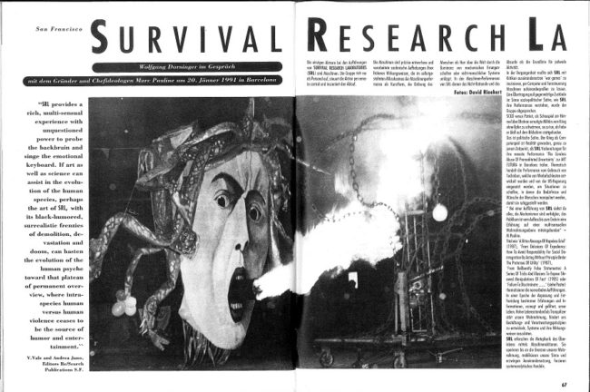»SRL provides a rich, multi-sensual experience with unquestioned power to probe the backbrain and singe the emotional keyboard. If art as well as science can assist in the evolution of the human species, perhaps the art of SRL, with its black-humored, surrealistic frenies of demolition, devastation and doom, can hasten the evolution of the human psyche toward that plateau of permanent overview, where intraspecies human versus human violence ceases to be the source of humor and entertainment.« V. Valle and Andreas Juno, Editors Re/Search Publications S. F.