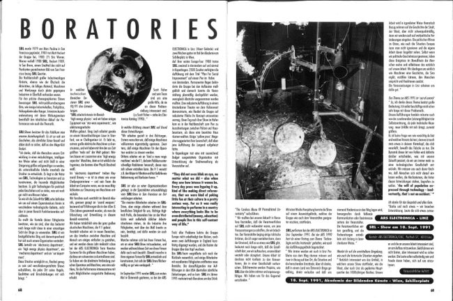 Ars Electronica Linz, SRL-Show am 10. September 1991, Kontakt: Ars Electronica, Postfach 57, 4010 Linz; voraussichtlicher Auftritt: Akademie der Bildenden Künste Wien, Schillerplatz am 18. September 1991